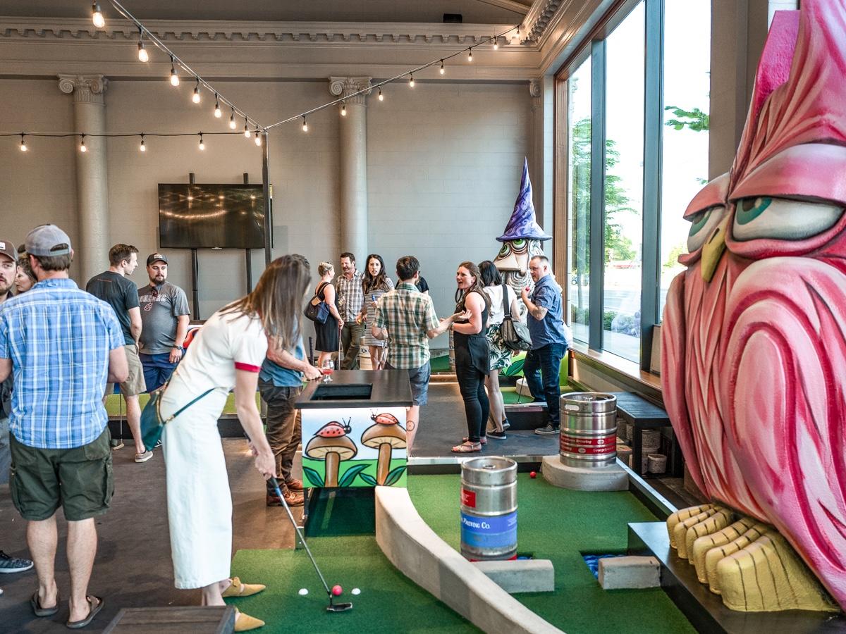 We're passionate about craft beer and supporting our Community. We only offer beer from independent breweries located here in the great state of Washington. You'll never find corporate beer here. We love to have fun, drink beer, and play games. In addition to mini golf you'll find original golf themed games invented by us at Flatstick. Duffleboard, Cup Hunter, and 'stick putt! are three of our new creations that you won't find anywhere else. Who knows what we'll come up with next. Whatever brings you in: first date, delicious beer, team building event, adult birthday party, watching sports, happy hour, or to challenge your friends at a game, our goal is to provide a place where everyone feels welcome to relax and have a great time.